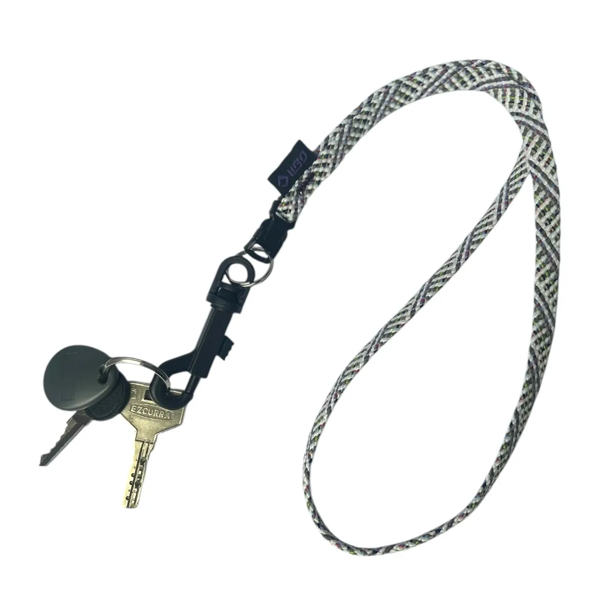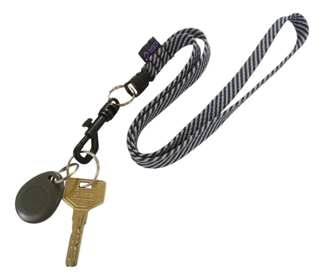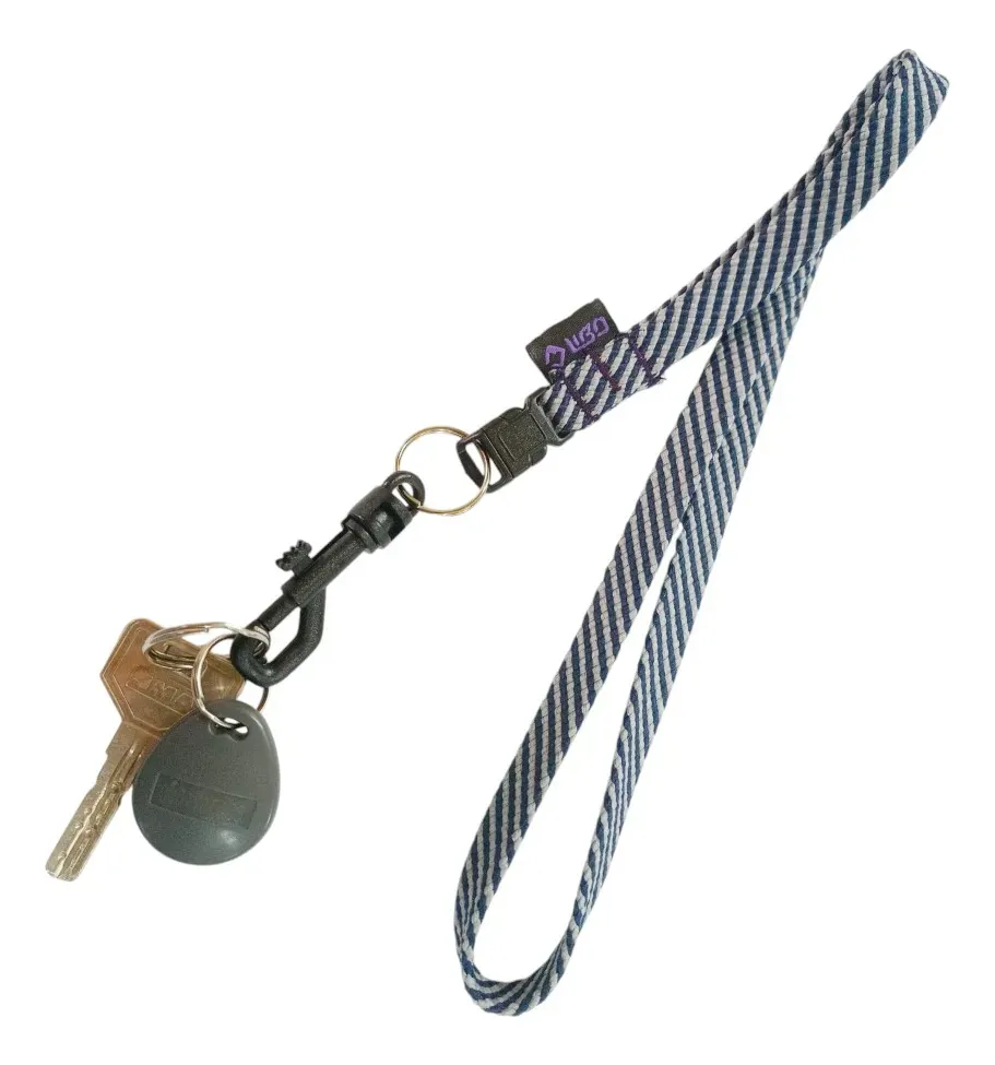 Llavero con cinta de 10 mm de ancho. Incluye una argolla llavero sin fin y un gancho de plástico para sujetar las llaves u otros objetos. La longitud total de la cinta es de 45 cm, con una apertura de 41 cm para facilitar su uso.