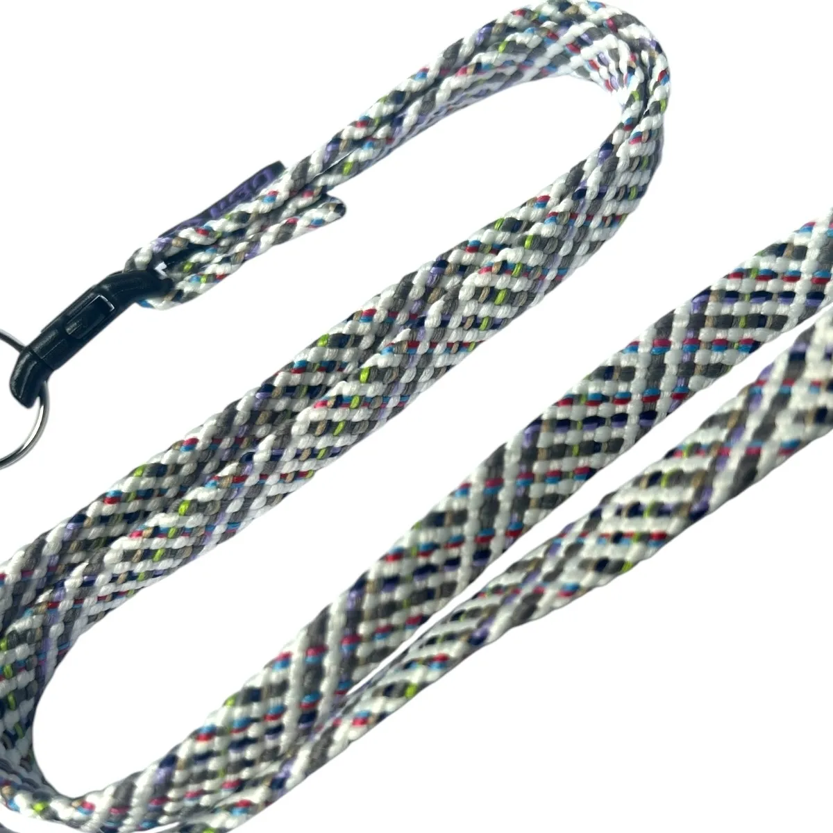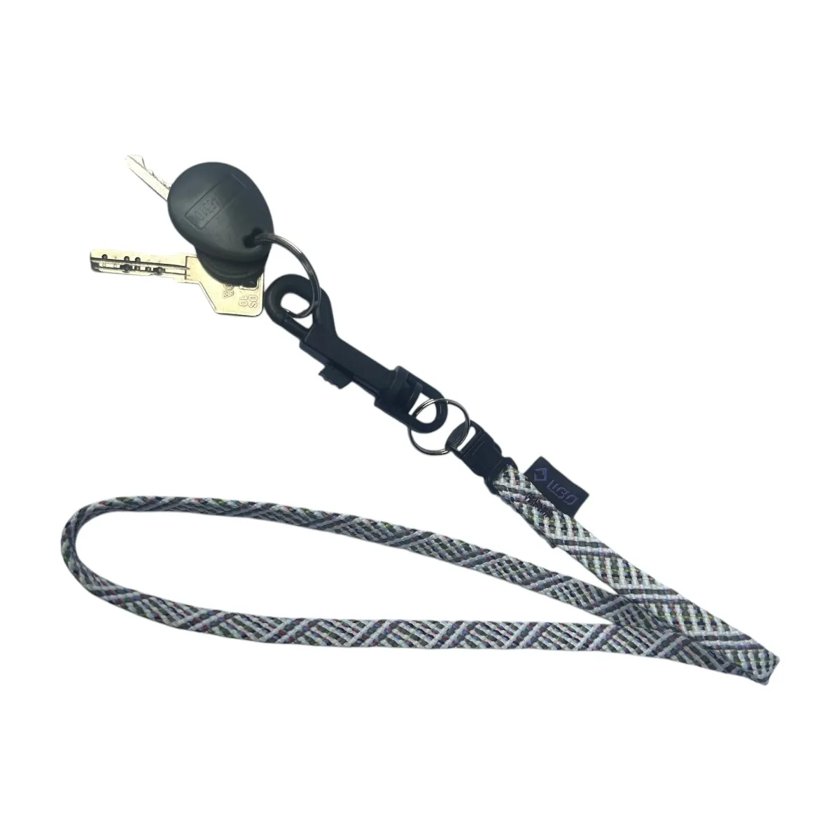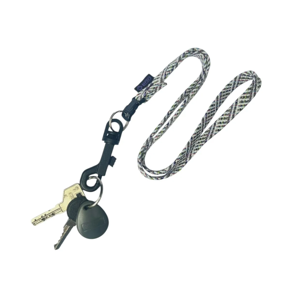 Llavero con cinta de 10 mm de ancho. Incluye una argolla llavero sin fin y un gancho de plástico para sujetar las llaves u otros objetos. La longitud total de la cinta es de 45 cm, con una apertura de 41 cm para facilitar su uso.
